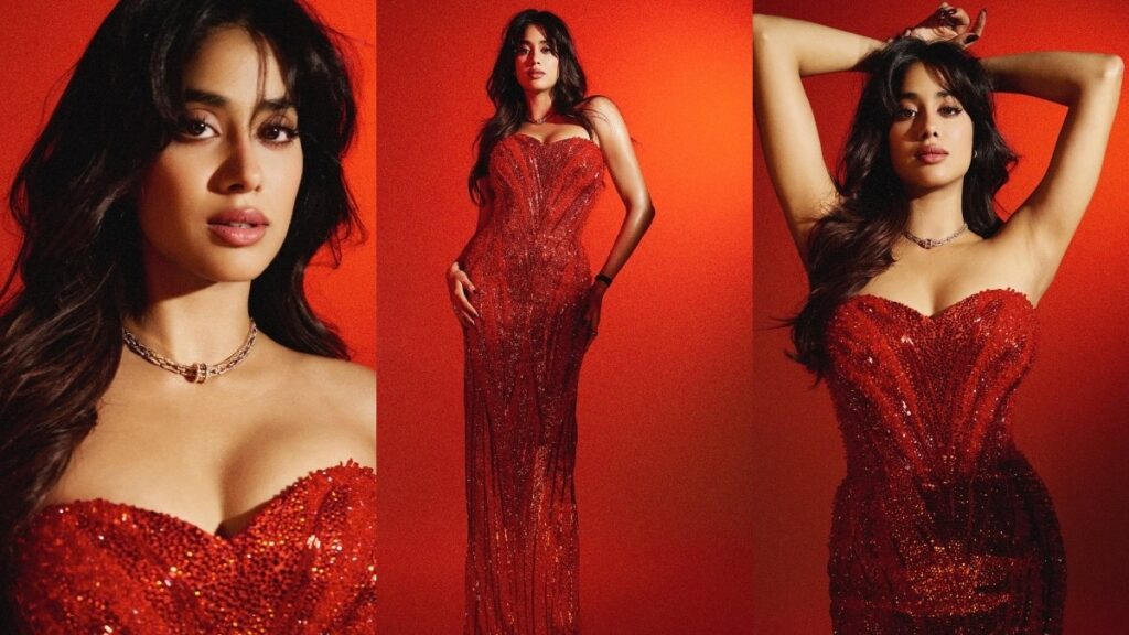 अवॉर्ड फंक्शन में जान्हवी कपूर ने रेड कलर का शिमरी ऑफ-शोल्डर गाउन पहना था, जिसमें वह बेहद ग्लैमरस और स्टनिंग लग रही थीं. इस गाउन की स्वीटहार्ट नेकलाइन और कॉर्सेट फिटिंग ने उनके लुक को और भी आकर्षक बना दिया था.